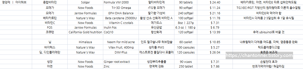 피부나 면역력에 좋다고 하는 것들과 가격대를 정리해보았었다. 이렇게 정리하고 나에게 맞는 것을 찾아보고