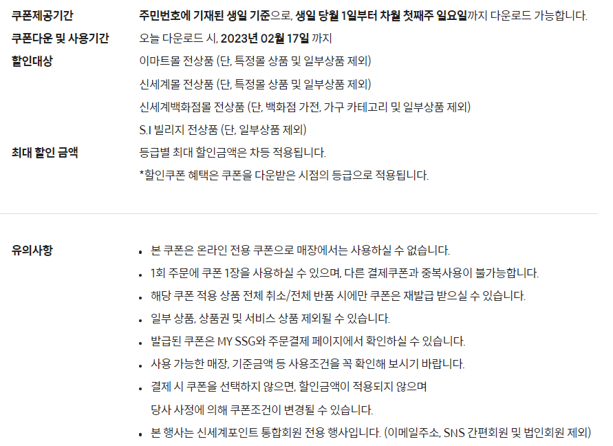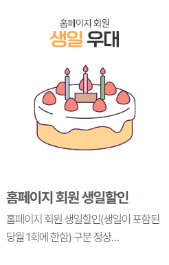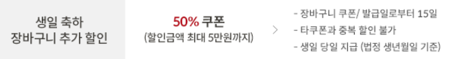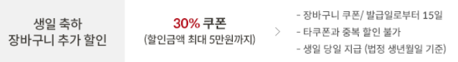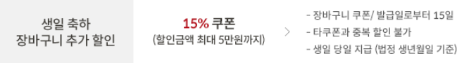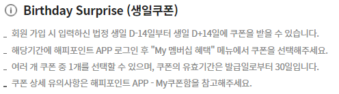 | 생일 15일 전 발급 및 발급일 포함 31일간 사용 예) 3월 16일이 생일이라면, 3월 1일부터 3월 31일까지 사용가능 |