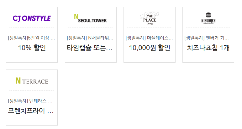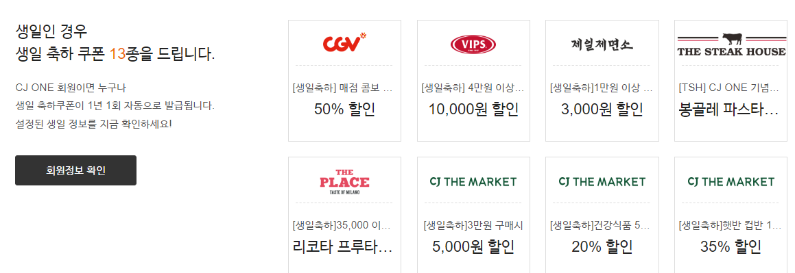 CJ ONE은 가장 많은 혜택이 모여있다. 통합회원의 경우 13종의 생일쿠폰을 제공한다.